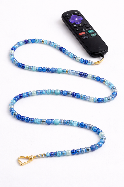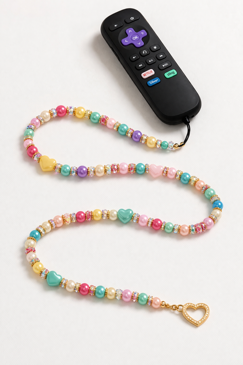 The Rainbow Remote Cord is designed to turn an everyday essential into something beautiful. Featuring a hand-strung mix of glossy beads, gold accents, and a signature heart clasp, this piece blends function with a jewelry-inspired finish.